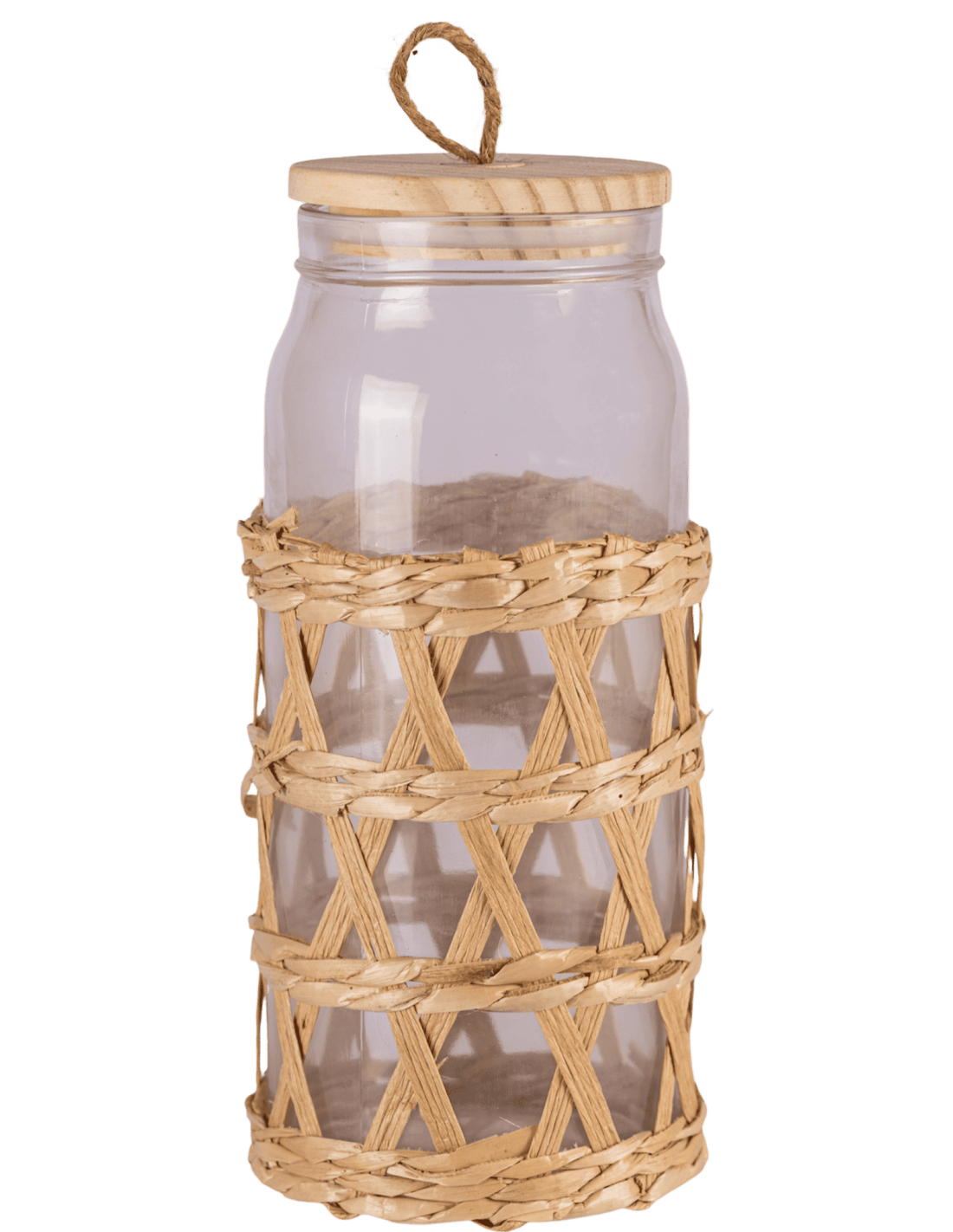 Frasco de Vidrio con Tapa de Madera - Cuerda de Yute - Malla de Fibra Natural